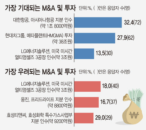 그밖에 웅진의 프리드라이프 지분 인수가 37표(16.6%)를 받으며 우려가 큰 M&A로 지목됐다. 웅진은 8800억원에 달하는 인수자금 대부분을 인수금융과 회사채 등 부채로 충당해 과도한 차입 인수라는 지적을 받았고, 과거 웅진의 코웨이 인수 실패 등 전적과 겹쳐 더 큰 우려를 낳고 있다. 석유화학 본업 부진 속에서 무리한 계열사 지원이라는 지적을 받은 효성티앤씨의 효성화학 특수가스사업부 인수도 29표(13.1%)로 우려되는 M&A로 꼽혔다.