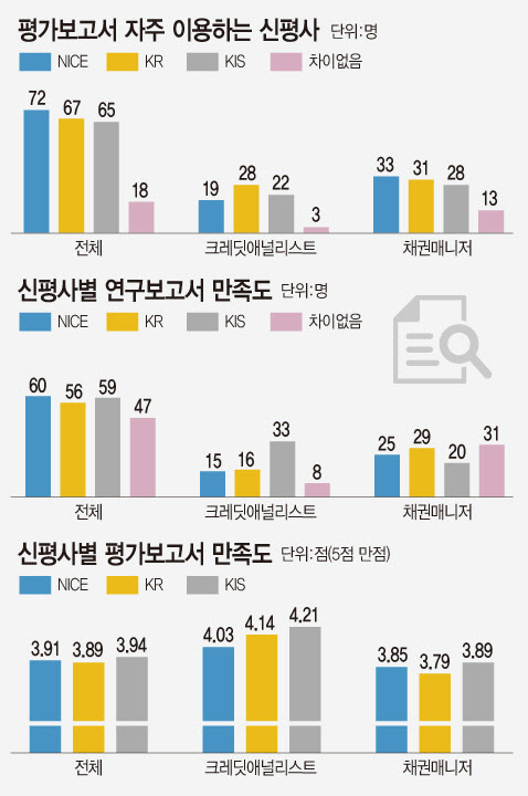 평가보고서(요지 포함)를 자주 이용하는 신용평가사를 묻는 질문에선 NICE신평이 72표(32.4%)를 얻으며 1위를 기록했다. 한기평과 한신평은 각각 67표(30.1%)와 65표(29.2%)를 기록했다. NICE신평은 연구보고서 만족도, 세미나 만족도, 평가보고서를 가장 자주 이용하는 곳 등 3곳에서 1위를 기록했다. ‘차이없다’는 응답은 18표(8.1%)에 그쳤다.