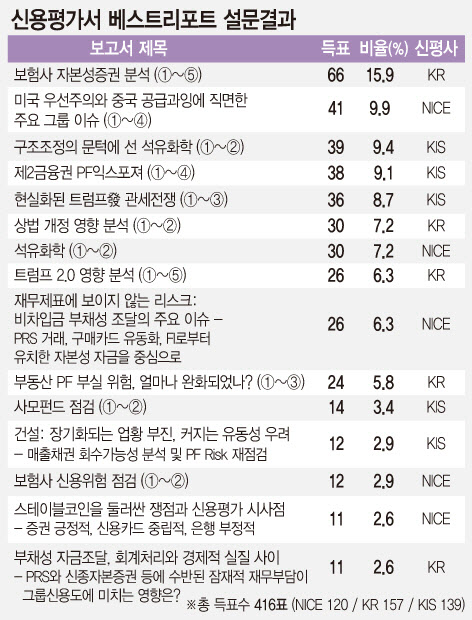베스트리포트 2위엔 NICE신평의 ‘미국 우선주의와 중국 공급과잉에 직면한 주요 그룹 이슈’ 시리즈가 총 41표(9.8%)로 이름을 올렸다. 올해 미국 도널드 트럼프 정부의 관세 이슈가 시장에서 가장 뜨거운 관심을 받았던 만큼 5위 한신평의 ‘현실화된 트럼프發 관세전쟁’(36표, 8.6%), 8위 한기평의 ‘트럼프 2.0 영향 분석’(26표, 6.25%) 등 3개 신평사가 모두 관련 보고서를 냈다.