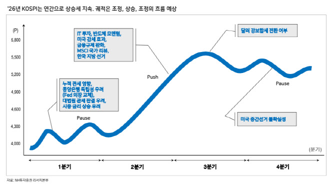 내년 시장 흐름에 대해선 단기 조정 후 완만한 회복을 예상했다. 그는 “1분기는 물가 변동과 연준 의장 교체, 관세 판결 등으로 변동성이 커질 수 있다”면서도 “AI 설비투자 사이클이 꺾이지 않는다면 조정은 ‘매수 기회’가 될 것”이라고 말했다. 이어 “2분기는 국내 지방선거·MSCI 리뷰 등 수급 요인이 긍정적”이라며 “하반기엔 달러 강도와 미국 중간선거 결과가 핵심 변수가 될 것”이라고 전망했다.