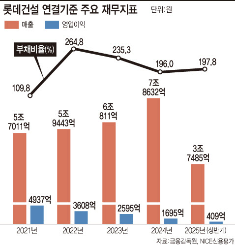 고금리 환경과 건설업 불안 속 롯데건설의 수익성은 빠르게 악화하고 있다. 2021년 5083억원에 달하던 EBITDA는 지난해 2314억원으로 반토막 아래로 떨어졌고, 올해 상반기 기준으로도 1100억원에 그쳤다. 다행히 부채비율은 매년 개선돼 2022년 268.7% 수준에서 지난해 202.2%, 올해 상반기 197.8%로 개선세를 보이고 있지만 시장에서 보는 불안감은 여전한 상황이다.