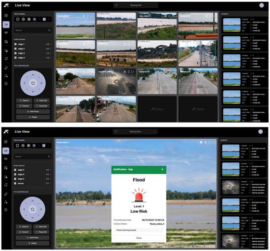 라온피플이 구축하고 있는 태국 붕깐주 AI융복합관제 솔루션(사진 위)과 수해탐지 솔루션(사진=라온피플)