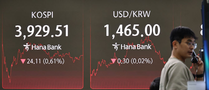 19일 서울 중구 하나은행 딜링룸 현황판에 코스피 지수 등이 표시되고 있다. 이날 코스피 지수는 전 거래일 대비 24.11포인트(0.61%) 내린 3929.51에, 코스닥은 7.38포인트(0.84%) 내린 871.32에 장을 마감했다. (사진=연합뉴스)