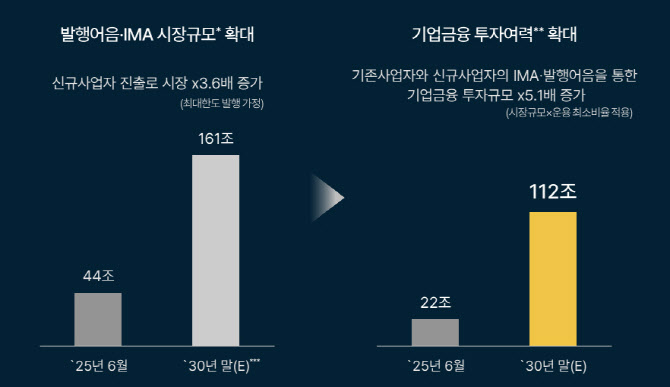 NH투자증권에 따르면 이날 인가를 발행어음·IMA 시장 규모가 2030년 말까지 161조원으로 성장할 것으로 전망하고 있다. 의무 투자 비중을 고려하면 중장기적으로 30조~40조원을 모험자본에 공급해야 하는 것으로 추산된다.