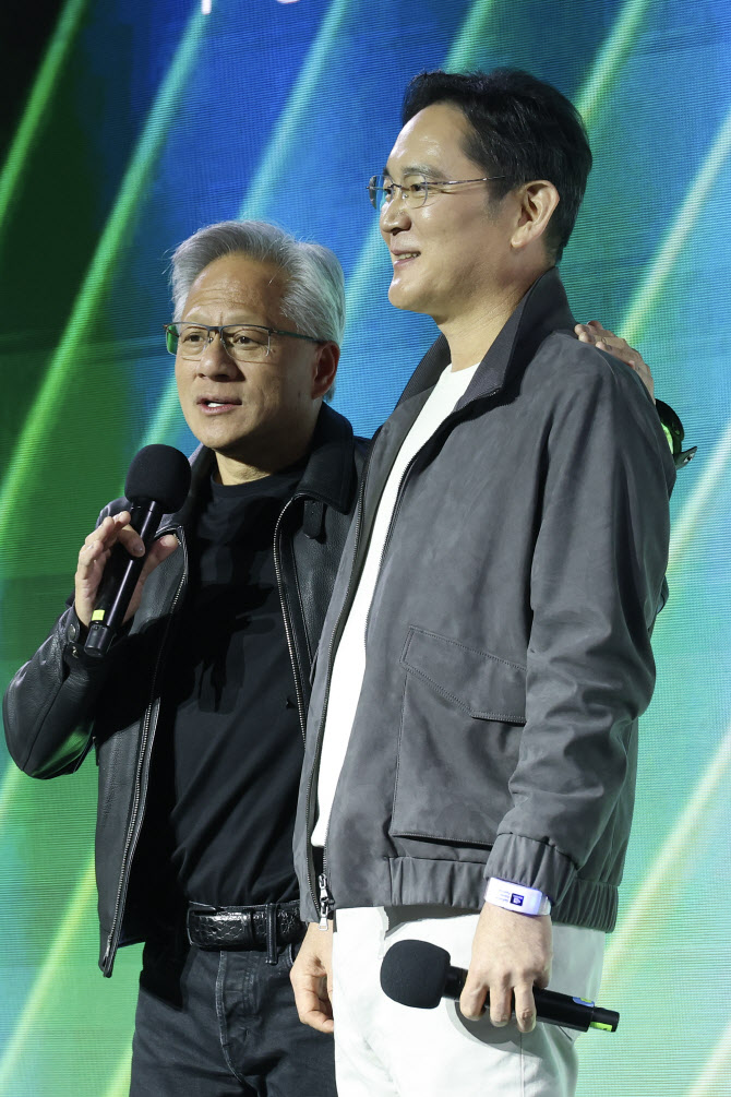 젠슨 황 엔비디아 최고경영자와 이재용 삼성전자 회장이 30일 서울 코엑스에서 열린 엔비디아의 그래픽카드(GPU) ‘지포스’ 출시 25주년 행사에서 단상에 올라 있다. (사진=연합뉴스)