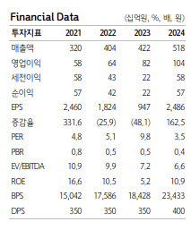 이어 “그럼에도 불구하고 추가 주주환원 여력은 충분하다”며 “2024년 총 배당금은 92억원(DPS 400원, 시가배당률 4.5%)이었고, 배당 확대 흐름을 감안하면 2025년 주당 배당금은 450원(시가배당률 5%) 이상이 예상된다”고 밝혔다.
