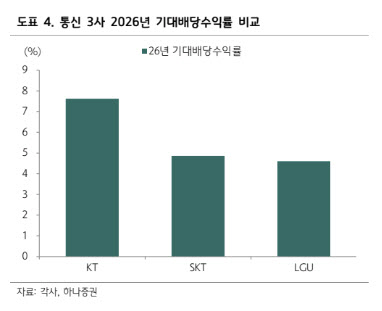 그는 “이러한 상황에서 2026년도에도 KT가 자사주를 추가 매입할 가능성은 낮다. 어차피 소각이 어려울 것이기 때문”이라며 “이런 상황에서 자사주 의무소각이 법제화된다면 KT가 자사주 매입을 강행할 가능성은 더욱 희박하다. 결국 2026년도에는 KT가 총 주주환원 9500억원을 모두 배당금로 지급할 가능성이 높다”고 했다.