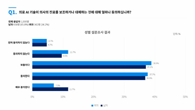 모바일 설문 플랫폼 크라토스(CRATOS)를 통해 전국 성인 남녀 1000명을 대상으로 진행된 이번 조사는 의료 AI 도입에 대한 일반 대중의 기대와 우려를 파악하기 위해 실시됐다.