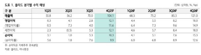 김홍식 하나증권 연구원은 “쏠리드는 올해 3분기까지 부진했지만 4분기에는 매출 이연 효과로 연결 매출액 1041억원(전년 동기 대비 +15%), 영업이익 121억원(+2%)을 기록할 전망”이라며 “전 부문 수요가 4분기로 몰리는 계절성과 함께 수익성이 높은 미국향 매출 비중 확대가 실적 회복을 이끈다”고 분석했다.