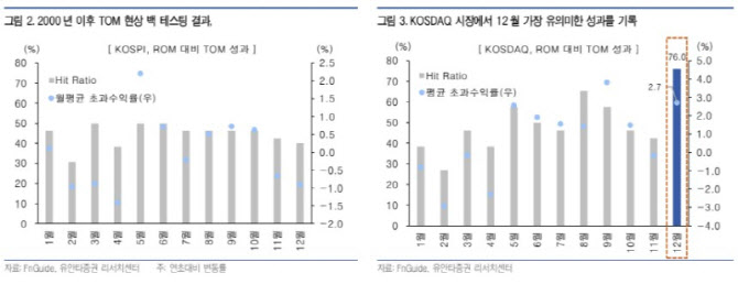 코스닥 시장에서는 2000년 이후 TOM 기간 수익률이 ROM 기간 수익률을 상회한 경우가 49.2%로 나타났다. 전체 기간으로 보면 코스피 지수와 큰 차이가 없지만 12월의 이 확률이 76.0%로 확인됐다.