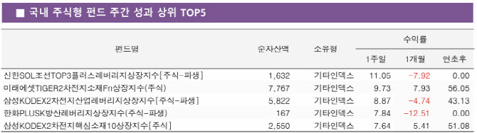 이밖에 2차전지를 테마로 한 ETF도 눈에 띈다. 미래에셋자산운용의 ‘TIGER 2차전지 소재 Fn상장지수’(9.73%), 삼성자산운용의 ‘KODEX 2차전지 산업 레버리지 상장지수’(8.87%), 삼성자산운용의 ‘KODEX 2차전지 핵심소재 10’(7.64%)이 한 주간 수익률 상위권 펀드에 이름을 올렸다.