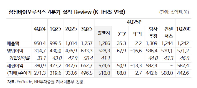 4분기 실적에 대해서는 일회성 요인에 따라 컨센서스를 하회한 것으로 분석했다. 한 연구원은 “4분기 매출은 1조2857억원으로 전년 대비 35% 증가했지만, 영업이익은 5283억원으로 컨센서스를 약 10% 하회했다”며 “배치 출하 타이밍 차이로 일부 매출이 4분기에서 1분기로 이연됐고, 에피스 분할 및 미국 공장 인수 관련 일회성 비용이 반영된 영향”이라고 설명했다.