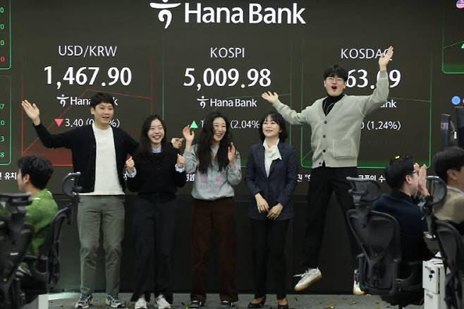 22일 오전 서울 중구 하나은행 본점 딜링룸 현황판에 코스피 지수가 장중 5000p를 넘으며 개장하고 있다.(사진=뉴스1)