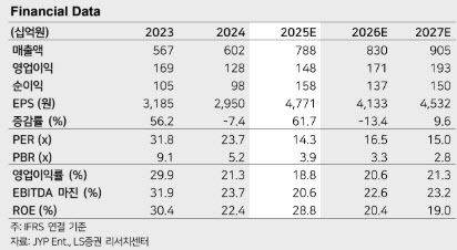 2026년 전망과 관련해 박 연구원은 “JYP의 내년 연결 매출액은 8301억원으로 5.4% 증가하고, 영업이익은 1713억원으로 15.5% 늘어날 것”이라며 “영업이익률은 20%를 웃도는 20.6% 수준이 예상된다”고 전망했다. 그는 “고연차 IP의 안정적인 활동과 저연차 IP의 글로벌 투어 확대가 매출 성장을 견인하고, 자회사 블루개러지의 점진적 회복이 수익성 개선에 기여할 것”이라고 설명했다.