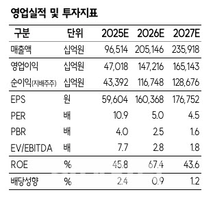 한 연구원은 “기존 예상을 상회하는 강력한 메모리 업황을 반영해 2026년 영업이익 147조원(전년 대비 213% 증가), 영업이익률 72%(전년 대비 23%포인트 증가)로 이익과 수익성 모두 사상 최대를 기록할 것”이라고 전망했다. 이는 시장 컨센서스 대비 영업이익은 34%, 영업이익률은 11%포인트 웃도는 수준이다.