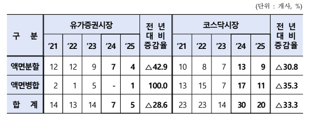 한국예탁결제원은 28일 ‘2025년 주식 액면변경 현황’ 자료에서 지난해 액면변경을 실시한 상장법인이 영풍(000670) 등 총 25개사로 잠정 집계됐다고 밝혔다. 시장별로는 유가증권시장 5개사, 코스닥시장 20개사로 각각 전년(유가증권시장 7개사·코스닥시장 30개사) 대비 감소했다.