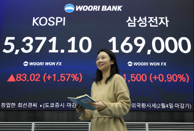 4일 엠피닥터에 따르면 코스피는 전 거래일 대비 83.02포인트(1.57%) 오른 5371.10에 거래를 마감했다. 종가 기준 사상 최고치다. 지수는 장중 한때 5376.92까지 오르며 장중 사상 최고치도 재차 경신했다.