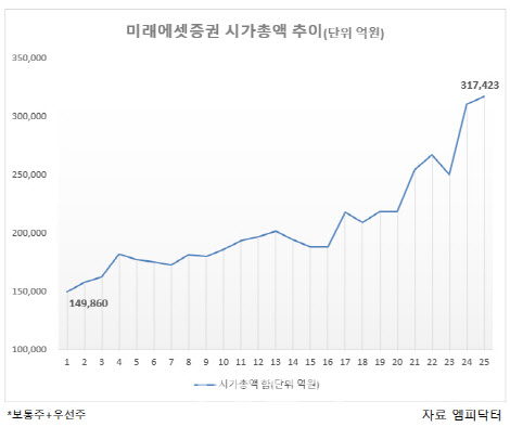 특히 미래에셋증권 시가총액은 금융지주인 우리금융지주(316140)(23조 5271억원)를 넘어 하나금융지주(086790)(31조 3117억원)도 웃돌고 있다.