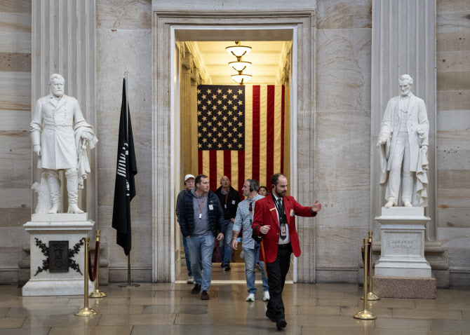 미국 정부가 재개된 첫 날인 13일(현지시간) 워싱턴 D.C의 국회의사당 가이드가 방문객을 안내하고 있다. (사진=AFP)