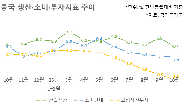 올해 고정자산 투자는 9월(-0.5%) 마이너스로 전환한 후 이달 들어 감소폭이 더 확대됐다. 중국 정부가 공급 과잉 산업에 대한 구조조정을 이어가면서 신규 투자가 위축된 것으로 보인다.