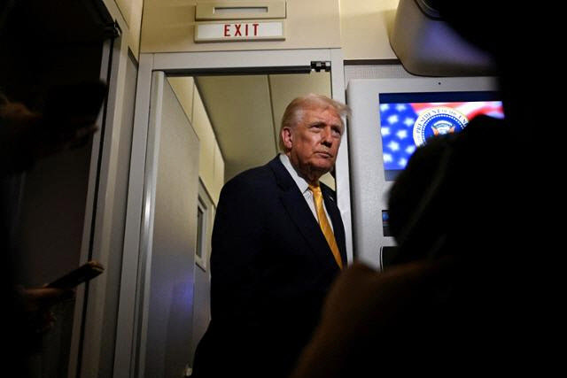 도널드 트럼프 미국 대통령이 14일 미국 플로리다로 향하는 대통령 전용기 에어포스원에 탑승해 기자들과 대화하고 있다. (사진=로이터/연합뉴스)