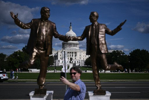 10월2일(현지시간) 워싱턴 DC 의사당 근처에서 한 남성이 도널드 트럼프 미국 대통령과 제프리 엡스타인이 손을 잡고 있는 모습을 형상화한 동상과 함께 셀카를 찍고 있다.(사진=AFP)