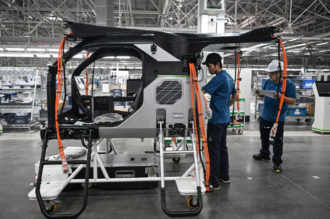 중국 남부 광둥성 광저우의 전기차 업체 샤오펑 공장에서 직원들이 일하고 있다. (사진=AFP)
