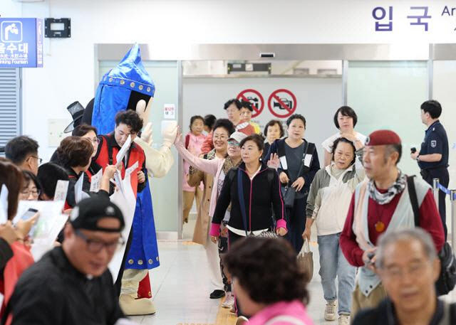 중국 단체관광객의 무비자 입국이 시작된 29일 크루즈를 타고 방한한 중국인 관광객들이 인천 연수구 인천항크루즈터미널을 통해 입국하며 손을 흔들고 있다.(사진=뉴스1)