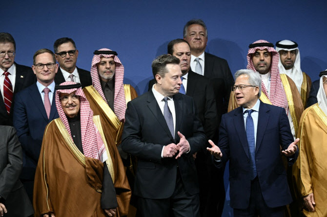 19일(현지시간) 미국 워싱턴 DC의 케네디센터에서 열린 미·사우디 투자 포럼에서 젠슨 황 엔비디아 최고경영자(CEO·오른쪽)와 일론 머스크(가운데)테슬라 CEO가 단체 사진 촬영 자리에서 논의를 하고 있다. (사진=AFP)