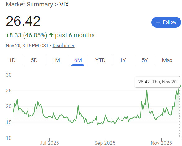 시장 불안을 보여주는 변동성지수(VIX)는 장중 28.27까지 치솟으며 10월 17일 이후 가장 높은 수준을 기록했다. 이후 일부 되돌려 26.42로 마감했지만, 여전히 장기평균(19.5)을 크게 웃도는 수준이다. 트럼프 대통령의 ‘해방의 날(Liberation Day)’ 관세 발표 당시인 4월에는 시장 혼란 속에 VIX가 60.13까지 폭등한 바 있다.