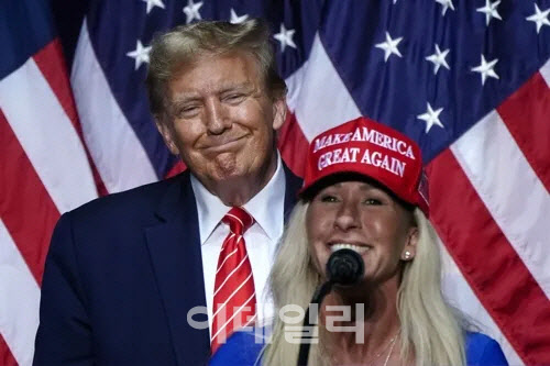 마저리 테일러 그린 하원의원(공화·조지아)이 지난해 3월9일 조지아주 로마에서 열린 선거 유세 행사에서 도널드 트럼프 대통령(당시 2024년 공화당 대선 후보)과 함께 연설하고 있다.[AFPBB]