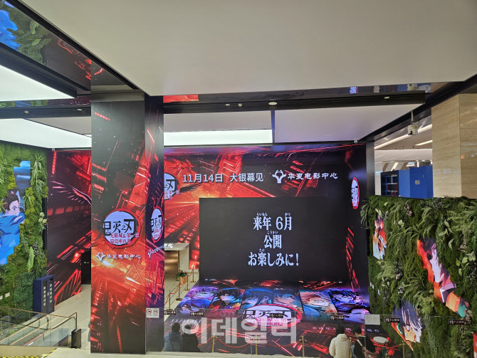 중국 베이징의 한 영화관 내 ‘귀멸의 칼날’ 홍보 게시물이 전시돼있다. (사진=이데일리 이명철 특파원)