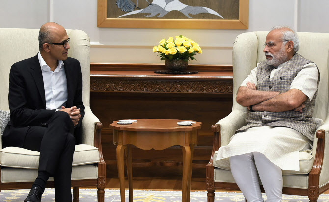 나렌드라 모디(오른쪽) 인도 총리와 사티아 나델라 마이크로소프트 최고경영자(CEO)가 2017년 2월 21일 인도 뉴델리에서 대화를 나누고 있는 모습. (사진=AFP)