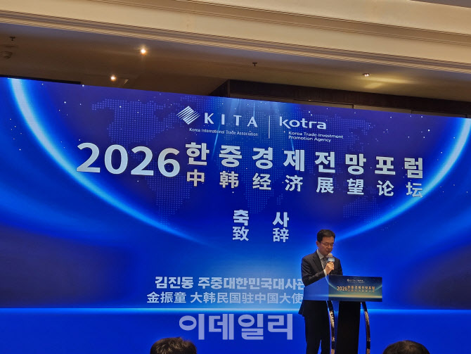 김진동 주중한국대사관 경제공사가 10일 베이징 켐핀스키 호텔에서 축사하고 있다. (사진=이데일리 이명철 특파원)