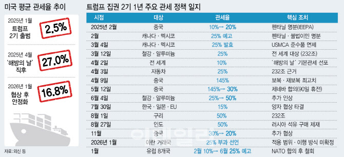 2017년 트럼프 1기 취임과 함께 ‘2차 탈세계화’가 시작됐다. 그리고 2025년 트럼프 2기 집권 1년을 맞은 지금, 관세는 국제 통상의 핵심 무기가 됐다. 트럼프 행정부는 국제비상경제권한법(IEEPA)과 무역확장법 232조를 동원해 전방위 관세 공세를 펼쳤다. 트럼프 재집권 직후인 지난해 2월 중국에 10% 관세를 부과한 것을 시작으로 4월 ‘해방의 날(Liberation Day)’에는 전 세계를 대상으로 기본관세 10%와 국가별 상호관세를 선포했다. 중국에 대한 관세는 한때 145%까지 치솟았다. 1930년 스무트-홀리법의 평균 40~50%를 훌쩍 뛰어넘는 수준이다. 미국의 평균 관세율은 2024년 2.5%에서 2025년 4월 27%까지 급등했다. 펜타닐, 불법 이민 같은 비경제적 이슈까지 관세의 명분으로 동원됐다.