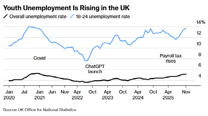 특히 젊은 층이 큰 타격을 받고 있다. 청년 실업률은 지난해 11월까지 3개월간 13.7%로 2020년 이후 최고치를 기록했다. AI가 초급 화이트칼라 일자리를 대체하는 동시에 영국 노동당 정부의 세금 정책이 소매·접객업 채용을 위축시키면서 양쪽에서 압박을 받고 있다.