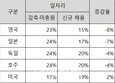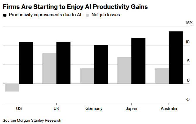최근 12개월간 AI 영향에 따른 국가별 일자리 증감 비교 (자료: 모건스탠리)