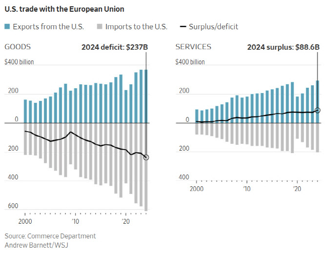 미국의 대유럽연합(EU) 상품·서비스 무역 추이 (단위: 10억달러, 자료: 미 상무부, WSJ)