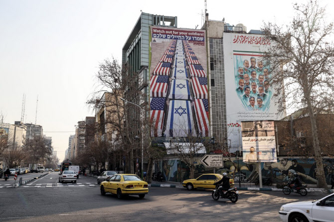27일(현지시간) 이란 테헤란에 위치한 한 건물에 걸려 있는 반미·반이스라엘 현수막.(사진=AFP)