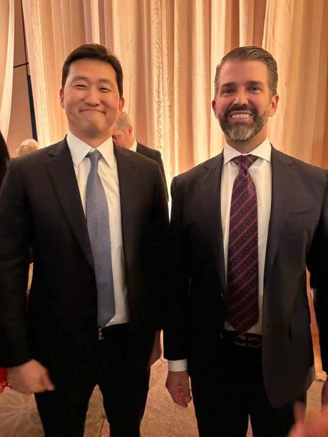 난해 1월 도널드 트럼프 미 대통령 취임식 전 비공개 리셉션에 참석해 트럼프 대통령의 장남 트럼프 주니어와 함께한 김범석 쿠팡 의장.(사진=연합뉴스)