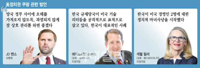 미국 의회에서도 쿠팡을 예로 들며 한국 정부가 미국 기술기업을 차별한다는 목소리가 커지고 있다. 이날 공화당이 주도하는 미 하원 법사위원회는 엑스(X, 구 트위터) 계정에 트럼프 대통령의 한국 관세 관련 SNS 게시물과 함께 “쿠팡 같은 미국 기업을 부당하게 표적으로 삼으면 이런 일이 벌어진다”는 글을 남겼다. 그동안 한국 디지털 규제법에 비판적 태도를 보인 캐롤 밀러(공화·웨스트버지니아) 하원의원은 한국의 정보통신망법 개정안을 ‘검열법’이라고 비난하고 쿠팡 조사를 ‘정치적 마녀 사냥’이라고 표현하기도 했다.