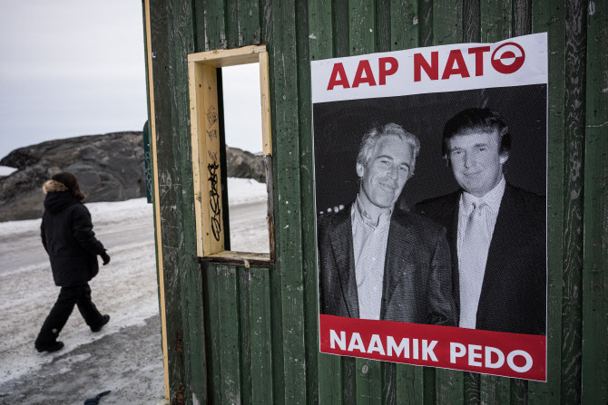 그린란드 누크의 한 버스 정류장에 성범죄자 제프리 엡스타인과 도널드 트럼프 미국 대통령의 사진이 담긴 포스터가 부착돼 있다. 포스터엔 그린란드어로 ‘나토 지지, 성범죄(PEDO) 반대’라는 문구가 적혀 있다. (사진=AFP)