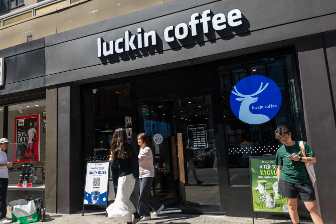 지난해 9월 4일(현지시간) 뉴욕 맨해튼에서 사람들이 루이싱 커피 매장 앞을 지나가고 있다. (사진=AFP)