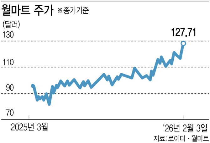 월마트 주가는 지난해 24% 상승한 데 이어 올해 들어서도 10% 이상 올라 스탠더드앤드푸어스(S&P)500 지수 수익률을 웃돌았다. AI 관련 기술주가 고평가됐다는 논란 속에 순환매 자금이 유입되면서 이날까지 월마트 주가는 4거래일 연속 상승했다. 경기 방어주로 꼽혔던 월마트는 지난달 9일 뉴욕증권거래소에서 나스닥시장으로 이전 상장하면서 성장주 측면이 주목받고 있다.