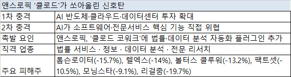 AI 기반 업무 자동화 도구가 빠르게 진화하면서 법률·데이터 분석·마케팅 등 그동안 고부가가치 전문 영역으로 여겨졌던 업무까지 대체할 수 있다는 점에 시장의 시선이 쏠리고 있다. 이에 따라 안정적인 구독 수익을 기반으로 성장해온 소프트웨어와 정보·전문 서비스 기업의 핵심 수익 구조가 흔들릴 수 있다는 우려가 확산하고 있다.