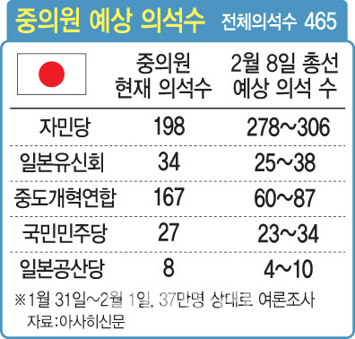 제1야당인 입헌민주당과 제3야당인 공명당이 합당해 출범한 중도개혁연합은 힘을 쓰지 못하고 있다. 이들은 지역구와 비례대표를 합쳐 기존 167석에서 60~87석으로 줄어들 것으로 예상한다. 같은 기간 아사히신문이 37만명을 상대로 전화 설문조사를 진행해 얻은 2만 2353명의 유효 응답 등으로 판세를 분석한 결과도 유사하다. 연립여당의 예상 의석수는 303~344석으로, 자민당은 단독 과반(233석)을 크게 웃도는 278~306석을 차지할 것으로 예상했다.