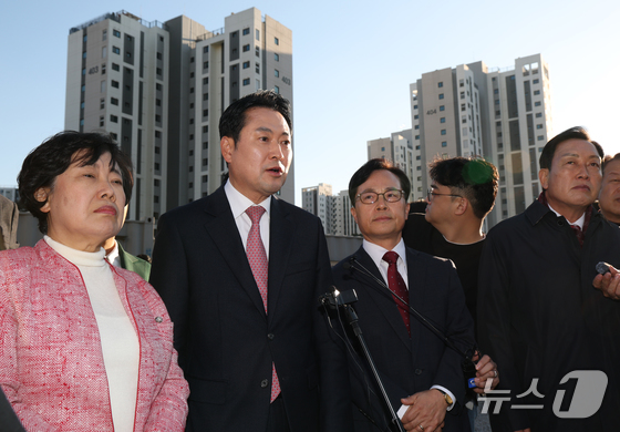 장동혁 국민의힘 대표가 지난 14일 오후 경기 성남시 분당구 대장지구 공공도서관 건설 현장을 방문해 현장 관계자의 설명을 듣고 있다. 2025.11.14/뉴스1 © News1 김영운 기자
