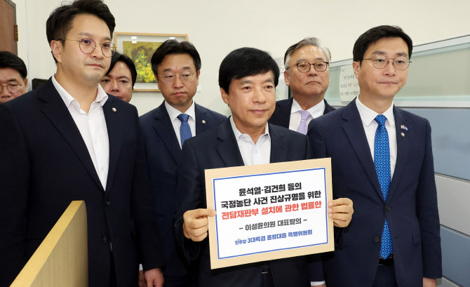 더불어민주당 3대특검 종합대응 특별위원회 소속 이성윤 의원 등이 ‘윤석열·김건희 등의 국정농단 사건 진상규명을 위한 전담재판부 설치에 관한 법률안’을 제출하고 있다. (사진=연합뉴스)