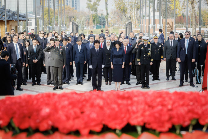 튀르키예를 국빈 방문 중인 이재명 대통령과 김혜경 여사가 25일(현지시간) 앙카라 한국공원 내 한국전 참전 기념탑을 찾아 묵념하고 있다.(사진=연합뉴스)