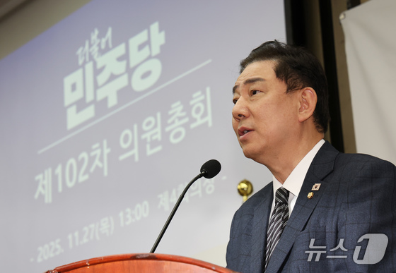 정청래 더불어민주당 대표가 27일 오후 서울 여의도 국회에서 열린 더불어민주당 의원총회에서 인사말하고 있다. 2025.11.27/뉴스1 © News1 장수영 기자